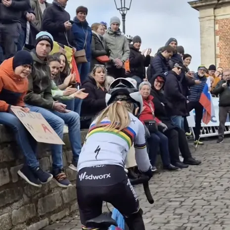 De 9-jarige Gioia deed dat, en hoe! In een wieleroutfit van haar grote voorbeeld Lotte Kopecky rijdt ze in een orkaan van geluid over De Muur. Ze doet dat met de tred en de stilo van een toekomstige wereldtopper.