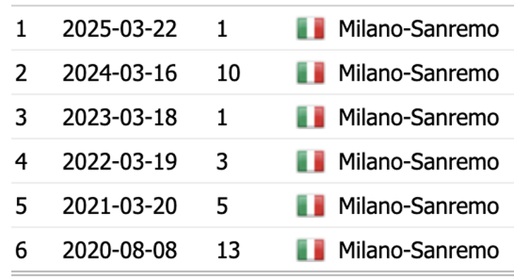 Van al die starts wist hij alleen in zijn eerste Milaan-Sanremo in 2020 niet in de top 10 te rijden - dat was de bijzondere corona-editie in augustus die Wout van Aert won; Van der Poel z'n motor moest nog even warmdraaien; hij won later wel de Ronde van Vlaanderen.