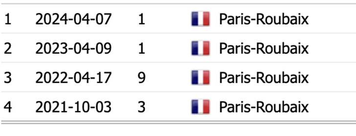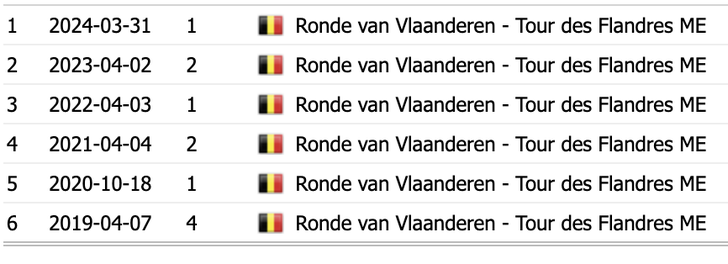 Maar we houden het even bij alleen Van der Poel in dit artikel. Zijn 'prestatiedichtheid' is namelijk niette bevatten hoog in de monumenten. Hieronder zetten we al z'n resulaten op een rijtje in de vijf koersen.