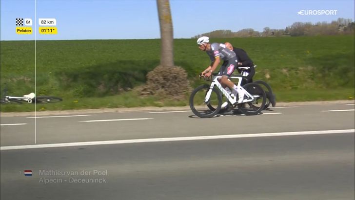 Wederom moest Mathieu van der Poel even voet aan de grond zetten in de Ronde van Vlaanderen. Na zijn eerdere valpartij heeft de Nederlander net op 80 kilometer van de finish van fiets gewisseld. Van der Poel ziet er nog lucide uit en lijkt geen enkele hinder te ondervinden van zijn val.