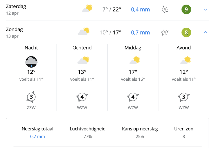 Daar waar de kans op natte kasseien dus aanwezig (maar klein) is, is de kans op waaiers een stuk groter. Er staat namelijk voldoende wind - en die staat in de goede richting. Weeronline voorspelt voor zondag in Compiègne windkracht drie uit de richting westzuidwest.