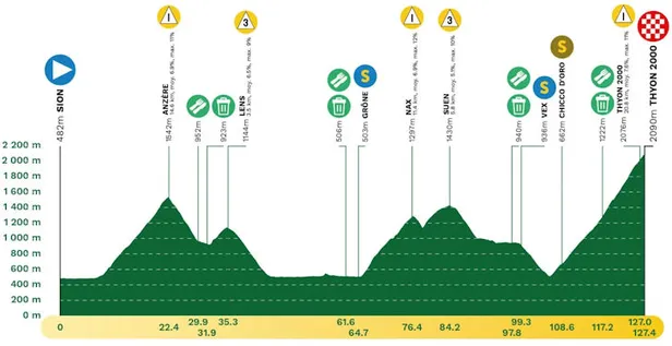 Hoe verwarrend etappe twee is, zo duidelijk is rit vier. Dat is verreweg de zwaarste en belangrijkste rit van deze Ronde van Romandië. De rit gaat over vijf beklimmingen, inclusief de lange en slopende slotklim naar Thyon 2000.