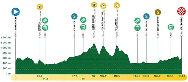 Op woensdag wordt de eerste etappe verreden tussen Münchenstein en Fribourg, waar de renners een punchy finale wacht. Ideaal voor renners als Benoît Cosnefroy, Andrea Vendrame (beide Decathlon-AG2R), Jan Christen (UAE) en natuurlijk Evenepoel zelf.