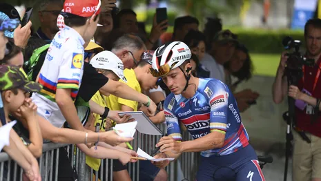 Nog voor de start van de bergetappe naar Valmeinier kwam Evenepoel met een verklaring. "Geen gouden helm? Dat is voor de warmte een beetje. Er is veel zon. Dat is de reden hierachter", zei hij tegen de aanwezige Belgische pers. Ook in de slotrit rijdt Evenepoel met een witte helm.