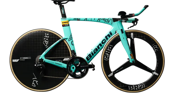 Tom Dumoulin krijgt dit jaar dus de Oltre XR4 onder de kont geschoven, de nieuwste versie van de Oltre. Overigens is nieuw vrij relatief, want de fiets heeft in 2017 voor het laatst een update gekregen. Het is volgens Bianchi de meest allround fiets die ze maken en dat blijkt ook wel, want Jumbo-Visma rijdt het hele jaar door op deze fiets. We zien hem in de sprints, maar ook in bergetappes en kasseienklassiekers. Al zal de ploeg voor Parijs-Roubaix kiezen voor de Infinito CV Disc, het meer comfortabele model met schijfremmen.