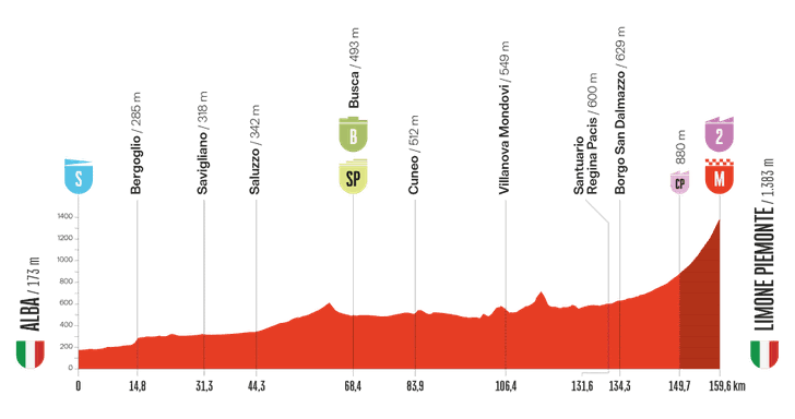 We zijn nog steeds in Italie en de etappe begint vlak vanuit Alba. Die kent lange tijd geen noemenswaardige hindernissen. Alleen de slotklim naar Limone Piemonte – in totaal 7,6 km lang met een gemiddeld stijgingspercentage van circa 5,4% is een scherprechter.