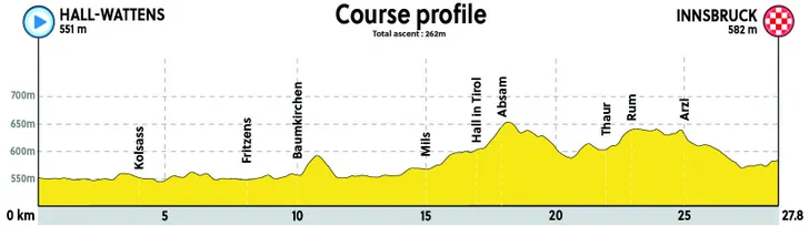Vanaf het startpodium, dat bij Swarovski's Kristalwelten in Wattens staat, gaan de eerste kilometers niet richting Innsbruck. Pas als de rensters de Inn zijn overgestoken wordt koers gezet naar de Tiroler hoofdstad.
