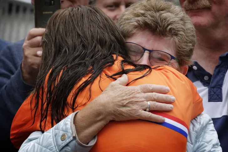 Moeder Ria, die ondanks de aanwezigheid van veel talloze fotografen ook kiekjes knipt met haar telefoon (mooi hè, moederliefde?), wacht aan de overkant. Samen tekenen ze voor misschien wel de mooiste omhelzing van wielerjaar 2017.