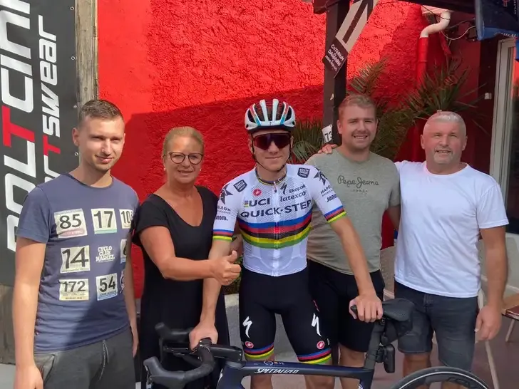 Niet lang daarna ging het ook over Evenepoels ambities voor het WK in Wollongong. Linda, door veel renners liefkozend ‘Mama Spain’ genoemd, beloofde hem levenslang gratis pannenkoeken bij een wereldtitel. Evenepoel reed later solo naar goud in Australië, waarna de rode muren nog meer betekenis kregen.