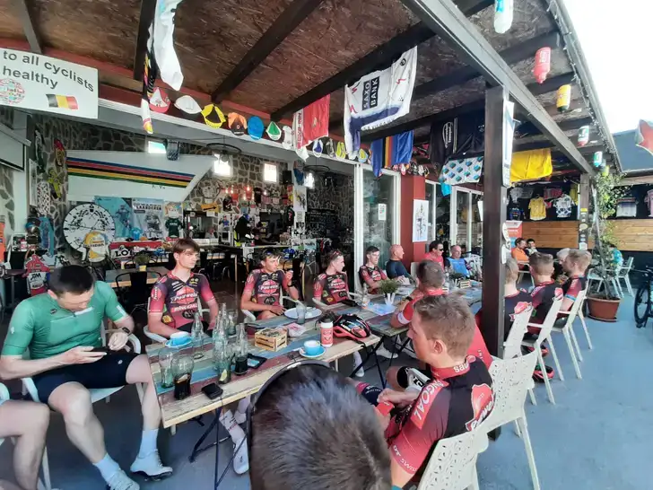 Zodra je binnenstapt, is er geen twijfel meer mogelijk. Wielershirts aan de muren, fietsen in het zicht en een terras waar profs en toerfietsers door elkaar zitten. Kom je rond lunchtijd binnenwandelen, dan kun je zomaar renners aan cappuccino en pannenkoek zien zitten. Ik zie de mannen van Tudor in het zonnetje zitten, en hoor dat ook Van der Poel en Remco Evenepoel hier regelmatig langskomen.