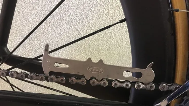 Je klikt de meter in een recht stuk ketting en laat hem zakken tussen de schakels. Valt hij niet in, dan is alles oké. Valt hij wel in bij de eerste markering, meestal 0,5 of 0,75, dan is het tijd om je ketting te vervangen. Komt hij ook bij 1,0 tot de bodem, dan ben je eigenlijk te laat en is de kans groot dat je cassette al mee gesleten is.
