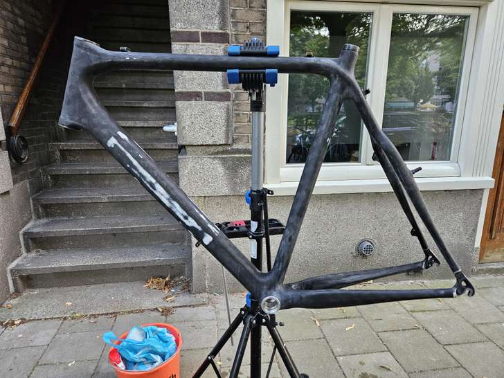 Zijn basis was een Ridley X-Fire van dertien jaar oud. Niet bepaald het nieuwste speelgoed, wél een frame met geschiedenis. Daarmee begon hij aan een totale make-over. “Vorig jaar heb ik 'm volledig gestript, gespoten en opnieuw opgebouwd.”