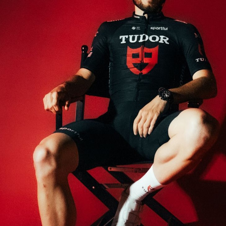 Het shirt van Tudor Pro Cycling Team is nauwelijks veranderd. Behalve dan dat het nóg zwarter is geworden: Sportfull is de nieuwe kledingsponsor en daarom zijn de witte mouwtjes met