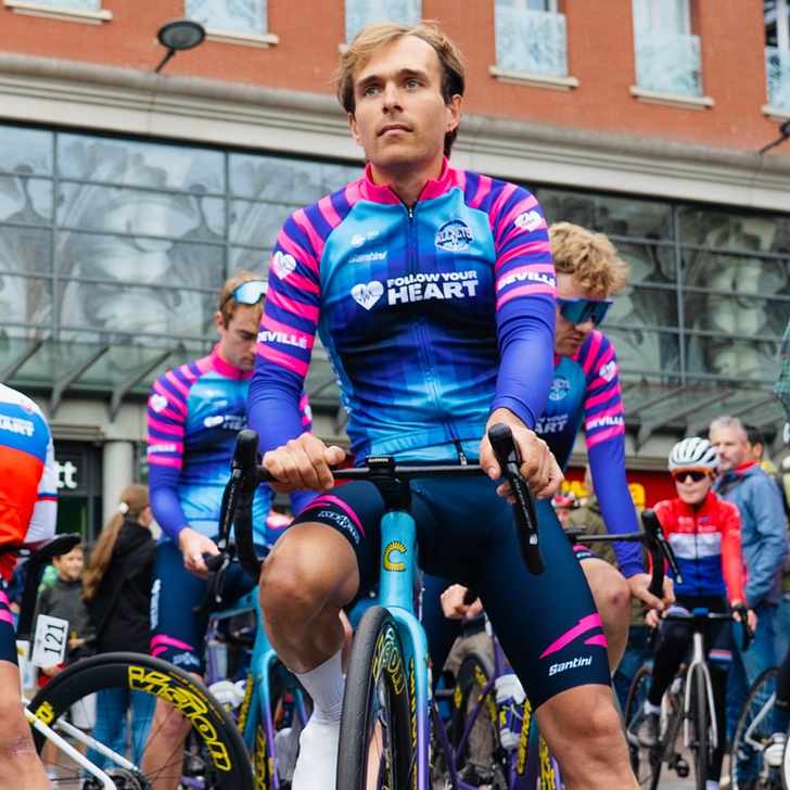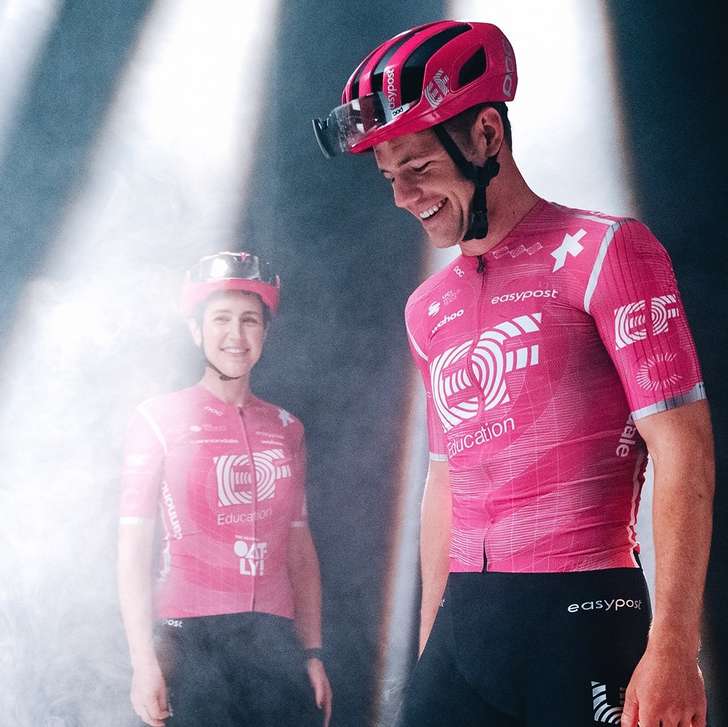 Natuurlijk is het shirt van EF Education-EasyPost in 2026 ook roze - en de broek zwart. Toch zijn de patronen in het tenue anders dan afgelopen jaar. Het argyle-patroon maakt plaats voor strakke lijnen en cirkels.