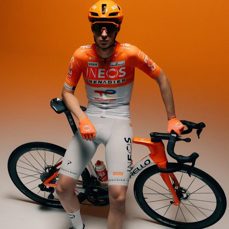 Het nieuwe tenue van INEOS Grenadiers is by far het meest opzienbarend van het peloton. De Britten kiezen namelijk voor een oranje met wit shirt en een grijswitte broek. Een gewaagde maar opvallende keuze.