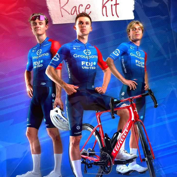 Groupama-FDJ United koerst in 2026 in hetzelfde tenue als in de Tour de France van 2025. Dat wil zeggen: een mix van donkerblauw en lichtblauw op het shirt, met één opvallende knalrode mouw. Een stijlvol tenue voor de Fransen.