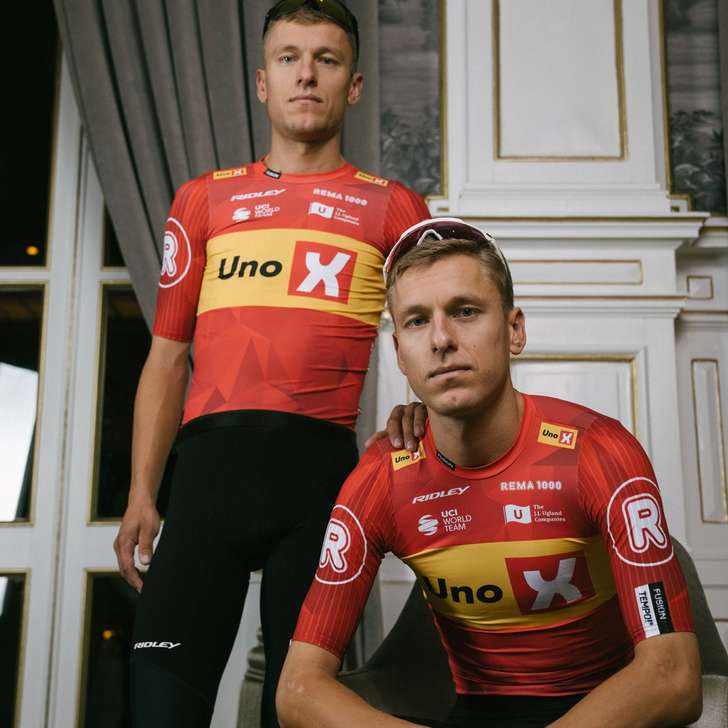 De Scandinaviërs van Uno-X Mobility koersen ook in 2026 in hun herkenbare balkenshirt. Een zware broek, een rood shirt en een gele balk. Opvallend: net als vorig jaar heeft het shirt géén rits.
