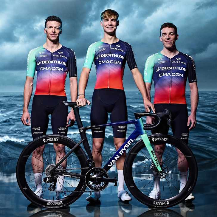 Het Franse Decathlon-CMA CGM drukt steeds steviger haar stempel op het peloton, nu ook in zichtbaarheid. De ploeg kiest namelijk voor een opvallend en kleurrijk tenue. De kleuren celeste, donkerblauw en rood lopen fraai in elkaar over.