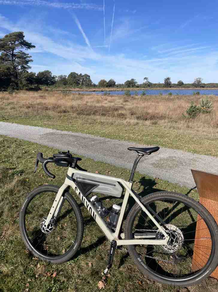 Wie de Canyon Grizl koopt met de verwachting van een snelle gravelracer, mist het punt. Dit is geen fiets die draait om topsnelheid of strak gesneden bochten op hard gravel. De Grizl is ontworpen met een ander uitgangspunt: comfort, stabiliteit en inzetbaarheid over lange afstanden, bij voorkeur met bepakking. Afgelopen herfst reed ik zo’n 20 keer op de Grizl, onder meer in het Fochteloërveen en de bossen rond Gasselte en Norg. Niet met het doel zo snel mogelijk over grindpaden heen te koersen, maar om te genieten van elke minuut.