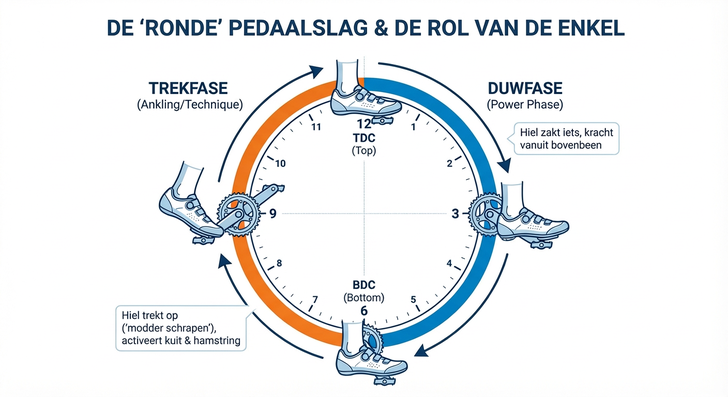 Een efficiënte pedaalslag is een ‘ronde’ beweging. Veel wielrenners maken zich echter alleen druk om de duwfase, het brute ‘stampen’ op het pedaal tussen twaalf en zes uur op de klok. Hierbij is de enkel vooral een stabilisator, die de voet recht op het pedaal houdt.