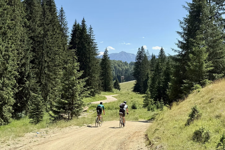 De mannen werden getrakteerd op wat ze zelf omschreven als een eindeloze ‘gravelslang’. De discussie onderweg ging niet over bloedzuigers, maar of de kwaliteit van de ondergrond de eretitel ‘champagnegravel’ of toch eerder ‘cavagravel’ verdiende. Het landschap bleek een aaneenschakeling van verrassingen. Waar je het ene moment door lommerrijke bossen fietst, sta je even later oog in oog met het imposante Bucegigebergte.