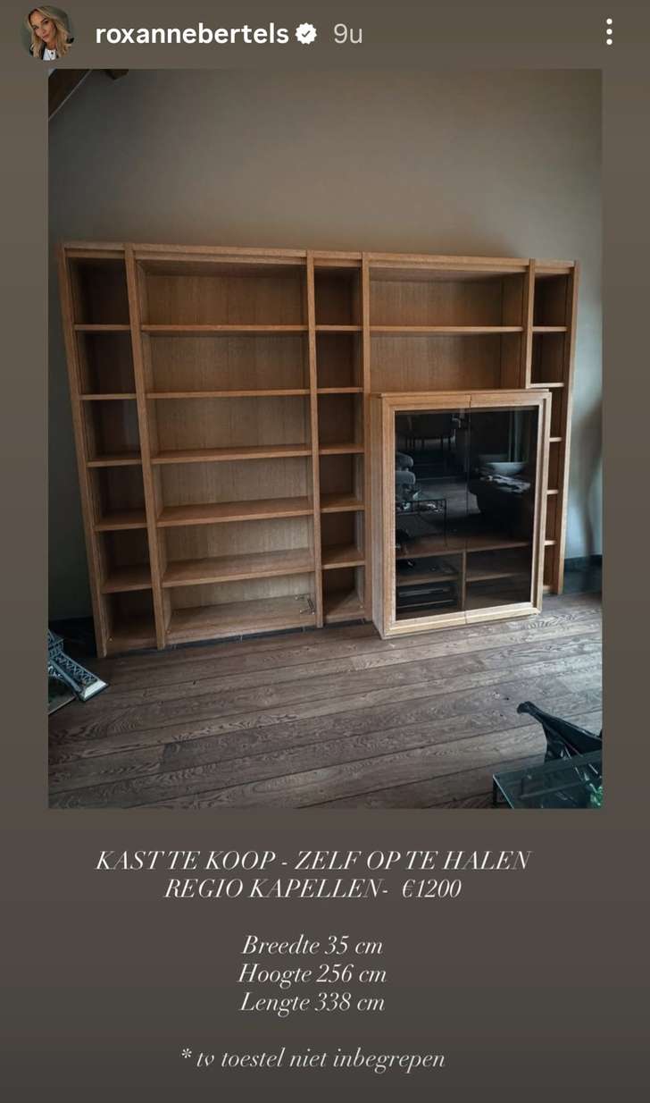 Op de Instagram-story van Roxanne prijkt een immense houten wandkast. Het gaat om een exemplaar van maar liefst 3 meter 38 breed en ruim 2 meter en een half hoog. Het meubel is voorzien van talloze vakken en een glazen vitrinegedeelte.