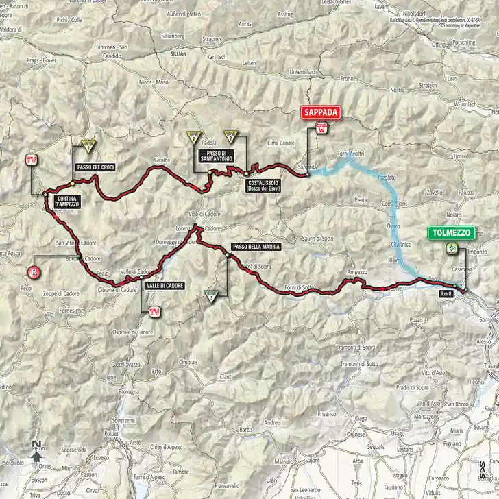 In de afdaling van de eerste klim, de Mauria pas, ligt de bron van de rivier Tagliamento. Na de tweede klim (Passo Tre Croci) en aan de voet van de derde klim (de Sant’Antonio-pas) rijden de renners door Cortina d’Ampezzo, thuisbasis van vele Italiaanse ijsboeren in Nederland. De Corsa Italia is dé winkelstraat met op de achtergrond de majestueuze Dolomieten-cols. Na de klim van Costalissoio is er de slotklim naar Sappada.
