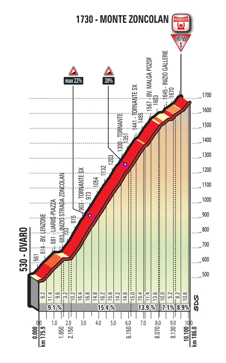 De Monte di Ragogna na 43 km en de klim naar Aviglio op tachtig kilometer van de finish zijn slechts voorproefjes op wat komen gaat. Zodra de renners de poort naar de Alpen gepasseerd zijn, krijgen de coureurs de Passo Duron voor de kiezen. En die begint met 18% meteen zeer steil. Nergens vlakt hij echt af, waardoor de renners vier kilometer lang op hun tandvlees naar boven moeten klauteren.
