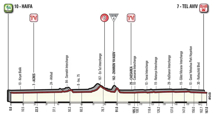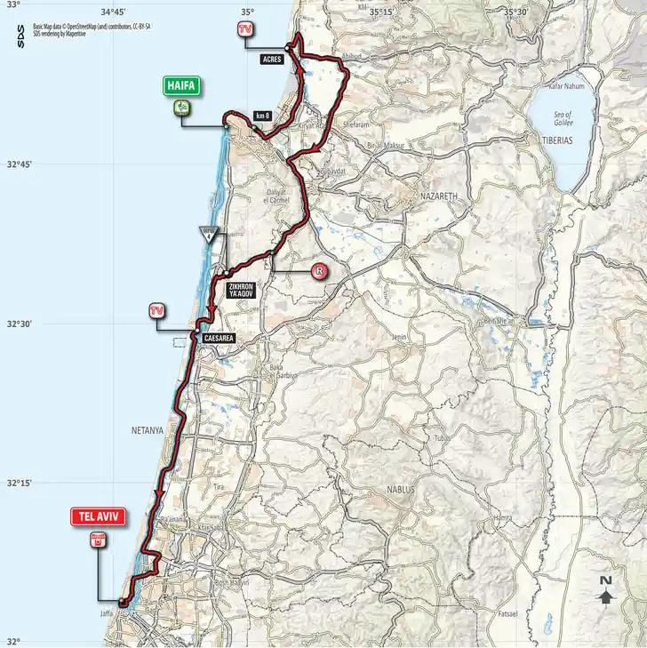Vanuit startplaats Haifa maken de renners eerst een noordwaartse lus van vijftig kilometer om bij Acre terug zuidwaarts richting Tel Aviv te gaan. Acre aan de noordkant van de Haifa-baai heeft een natuurlijke haven en dat is zeldzaam aan deze kust. Door zijn haven is het een van de oudste woonplaatsen in de wereld, die al bewoond is sinds het Bronzen Tijdperk zo’n 4.000 jaar geleden. Als de renners vanaf Acre naar het zuiden rijden laten ze Nazareth links liggen. Halverwege de etappe is er een molshoop gevonden om de eerste bergprijs te kunnen uitdelen.