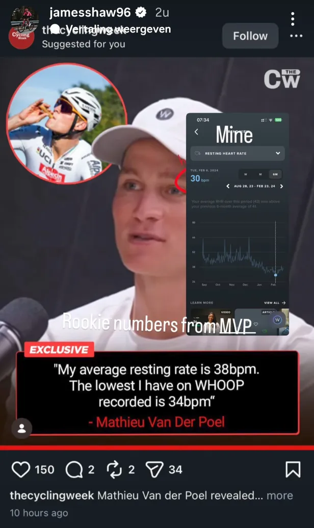 Het toont zijn onwijze sporthart aan, maar niet iedereen is even onder de 'indruk'. De EF Education-EasyPost-renner James Shaw deelt met een knipoog zijn eigen data op Instagram. Waar zijn gemiddelde van 43 hartslagen per minuut in die periode hoger lagen dan Van der Poel, had hij met dertig slagen per minuut wel een lager minimum. "Rookie cijfers van Van der Poel", zette hij erbij.