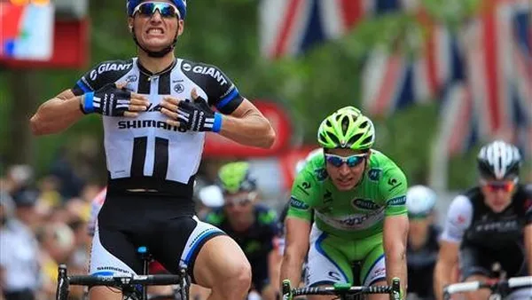 Marcel Kittel heeft zijn suprematie nog maar eens onderstreept met een klinkende sprintzege op The Mall in Londen. De Duitser van Giant-Shimano was aan het eind van de derde Tourrit duidelijk de snelste. Peter Sagan zat perfect in het wiel van Kittel, maar kwam er nooit uit. Mark Renshaw, normaliter de loods van de nu geblesseerde Mark Cavendish, werd derde. Danny van Poppel sprintte in het natte Londen naar de zesde plaats.